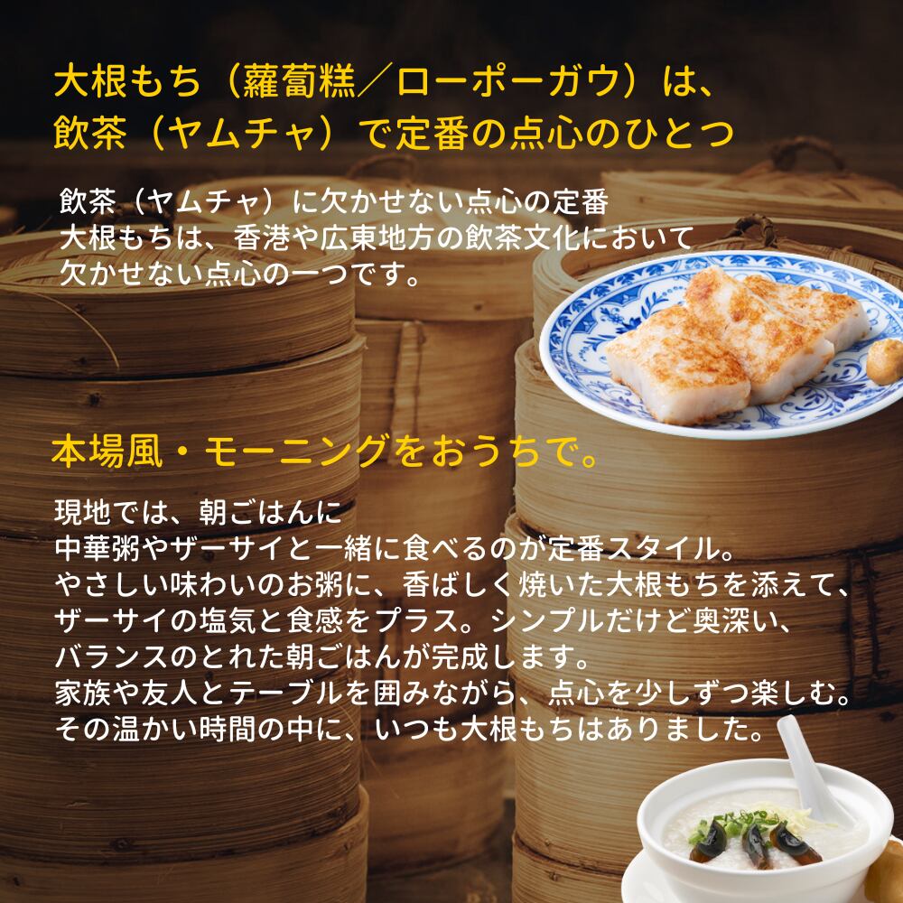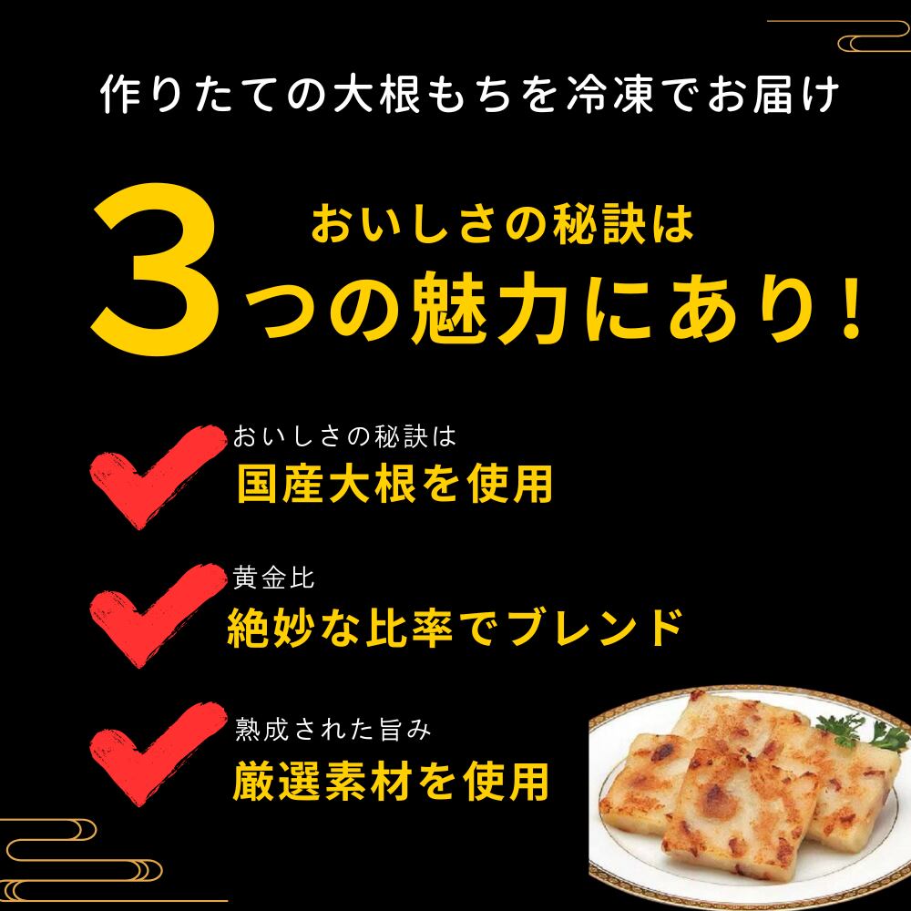 自宅で手軽に楽しめる新しい触感の大根餅です。大根を餅のようにふわっと仕上げ、自宅で簡単に焼くことができます。しっとりとした食感と大根の優しい風味が口いっぱいに広がります。蒸かずに焼くことで、さっくりとした歯ごたえとモチモチ感を楽しむことができます。